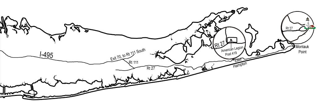Take Rt 27 West. American Legion is on your right hand side, in East Hampton, right after amangasset. Estimated time is about 15-20 minutes (12 miles). |